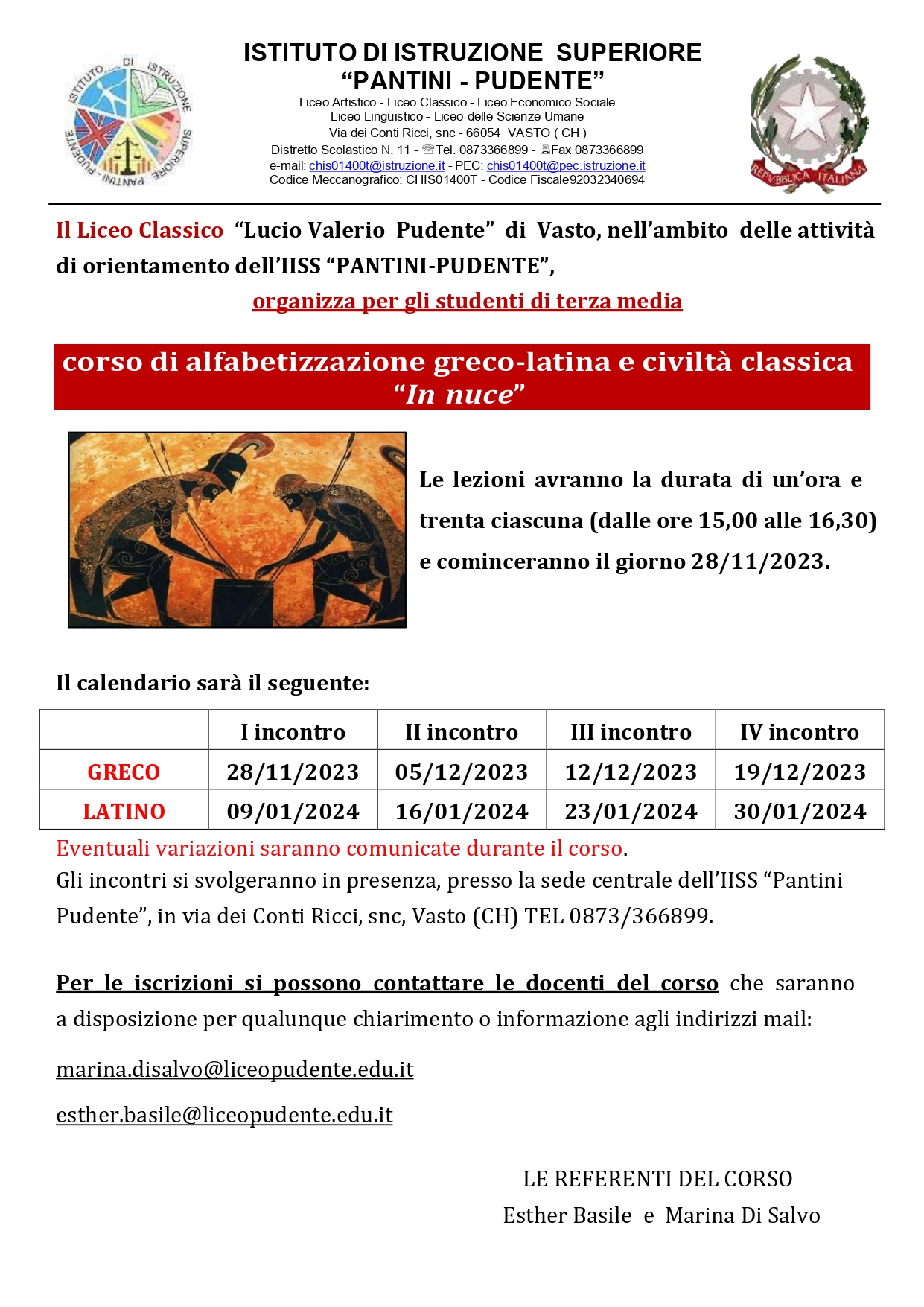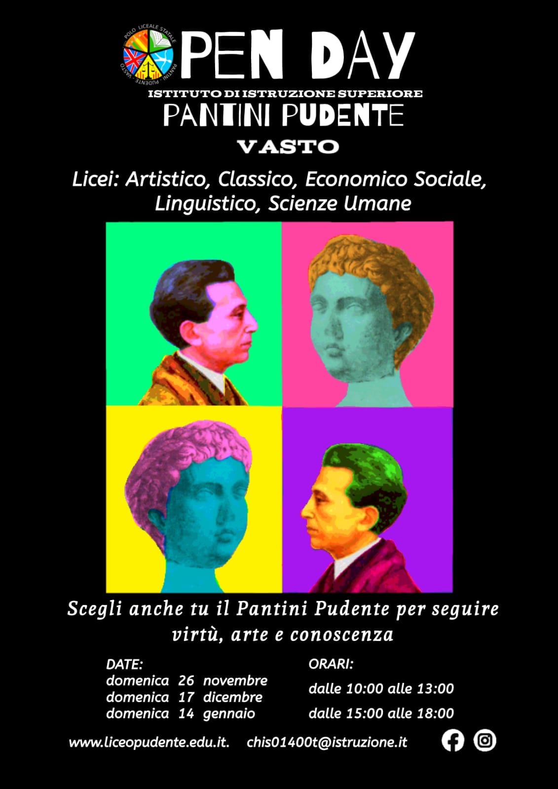 Liceo Artistico e Liceo del Made in Italy presso la sede centrale in via dei Conti Ricci snc; Liceo Classico e Liceo Linguistico presso la sede di Via Dante Gabriele Rossetti, 2 (sede storica del Classico); Liceo Economico Sociale e Liceo delle Scienze Umane presso la sede di via Madonna dell'Asilo (ex Magistrale)