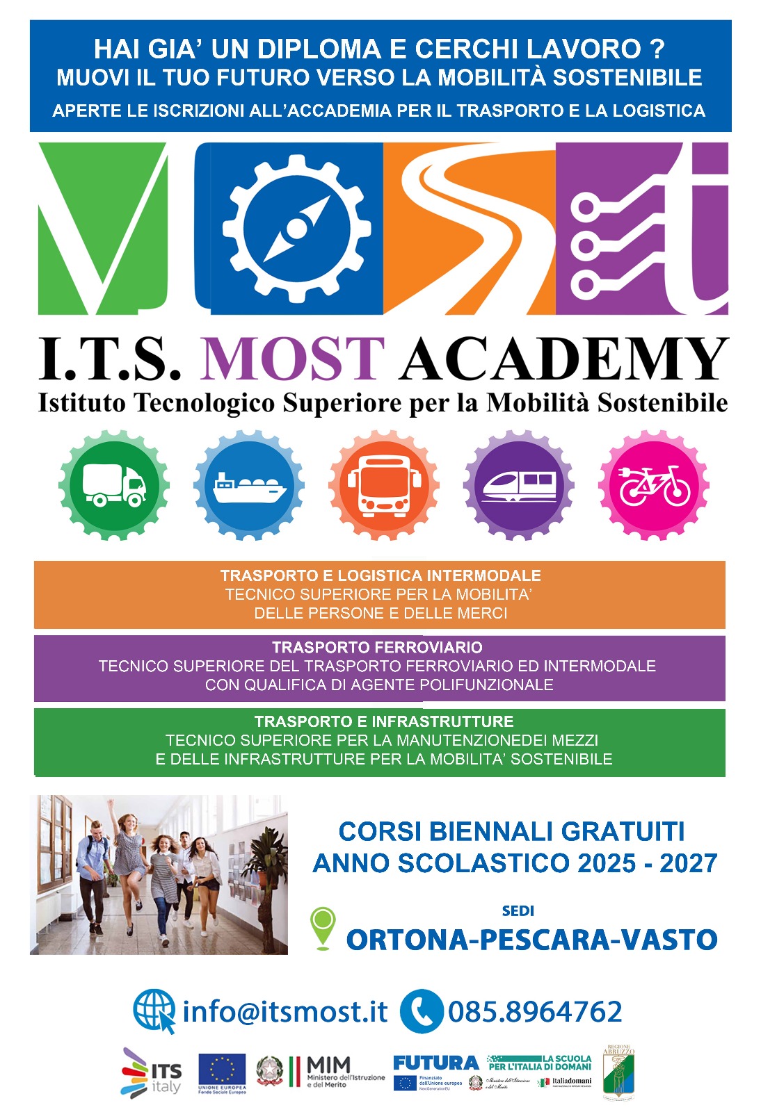 l’I.T.S. MOST Academy – Istituto Tecnologico Superiore per la Mobilità Sostenibile di Ortona (CH) ha aperto le Iscrizioni per Corsi biennali gratuiti di formazione tecnico-specialistica nei settori del Trasporto e Logistica Intermodale; Trasporto ferroviario; Logistica Industriale; Infrastrutture e manutenzione