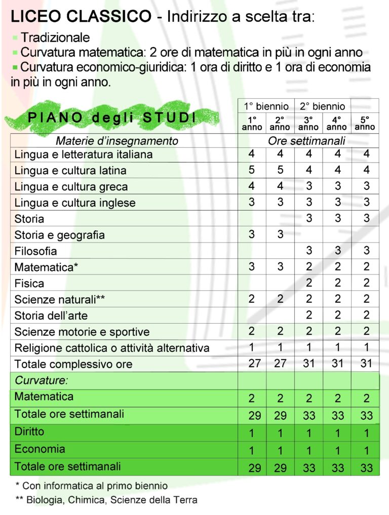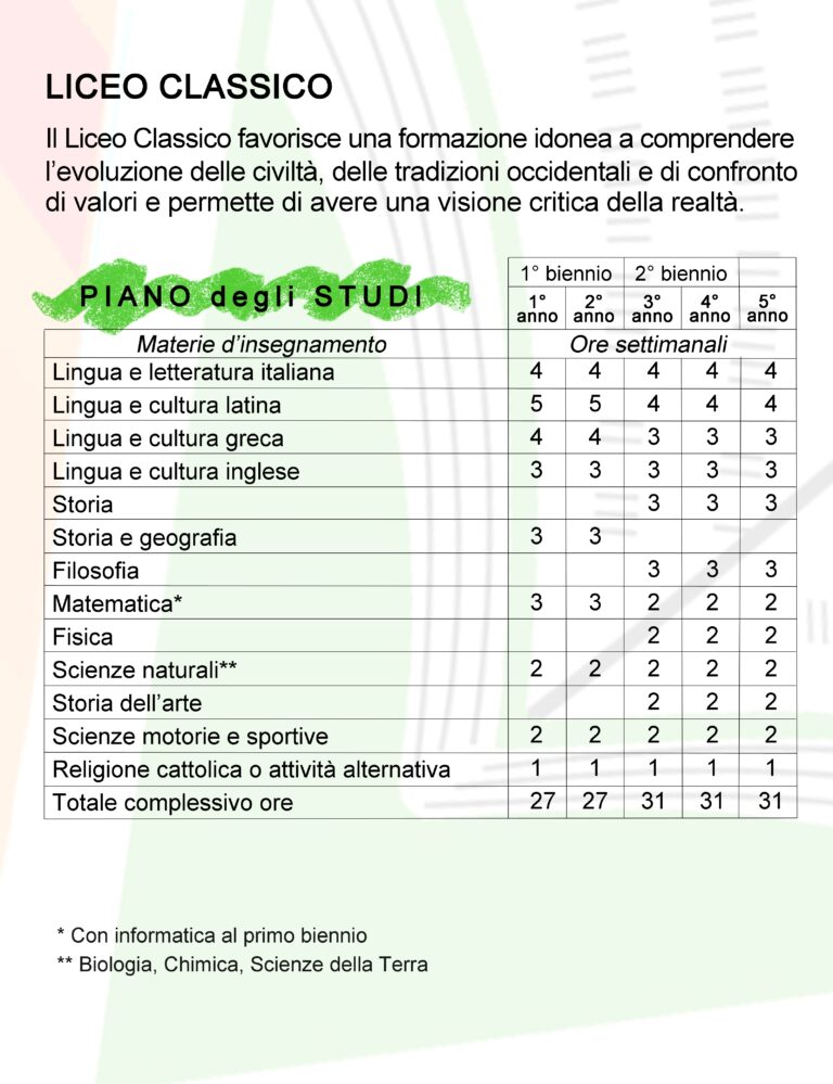 Il liceo classico consente di approfondire lo studio della civiltà classica e della cultura umanistica (letteratura italiana e straniera, storia, filosofia, storia dell’arte), senza per questo trascurare le scienze matematiche, fisiche e naturali. Gli studenti possono così comprendere la realtà contemporanea alla luce del confronto con la civiltà classica, che ha avuto un ruolo decisivo nella formazione della civiltà occidentale. L’accesso alla cultura classica è assicurato dallo studio intensivo del greco antico e del latino.